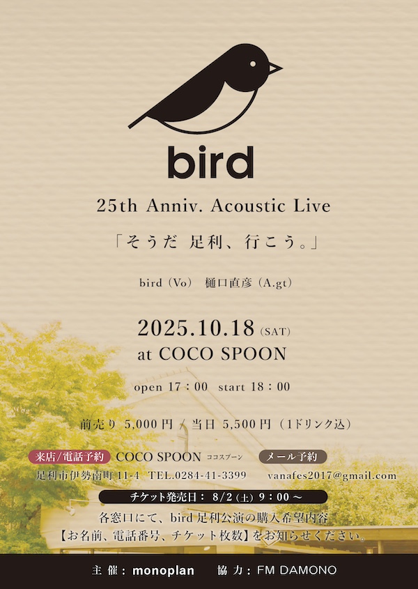メール予約 → vanafes2017@gmail.combird ”そうだ 足利、行こう。” 25th Anniv. Acoustic Live